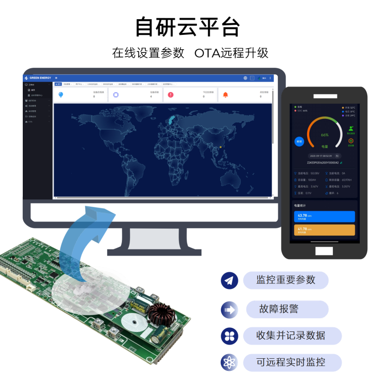 3、全栈自研BMS云平台+APP,支持实时数据监控、故障预警与远程升级;更可根据客户需求深度定制界面、功能模块与对接协议,打造专属智能化管理体系。